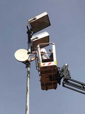 Mittels eines Steigers wurden in schwindelerregender Höhe die defekten Lampen ausgetauscht.